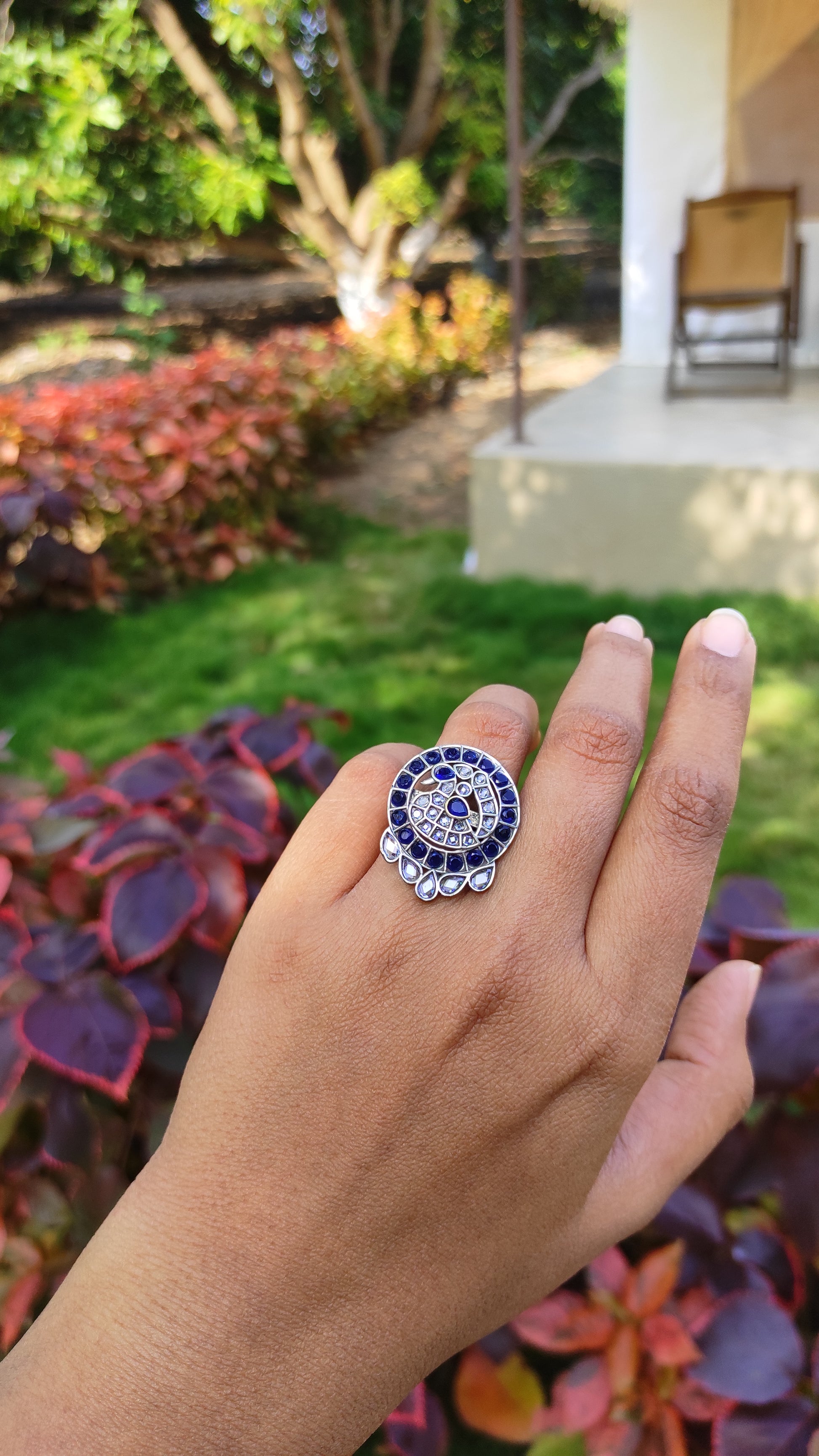 It showcases intricate peacock motifs, studded with simmering white stone and blue stone giving the finishing touch
