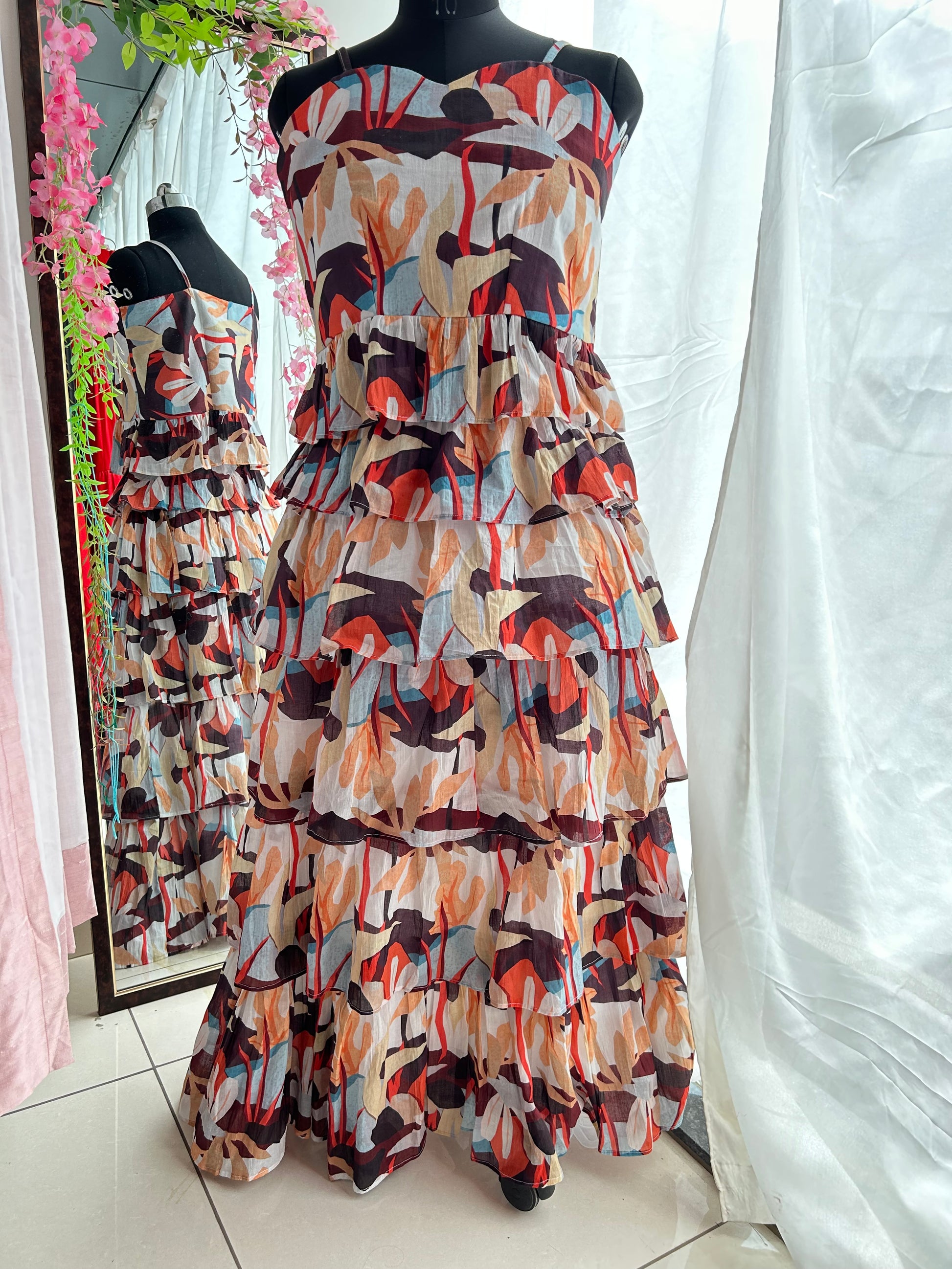 - It features a flared and multilayered ruffles.