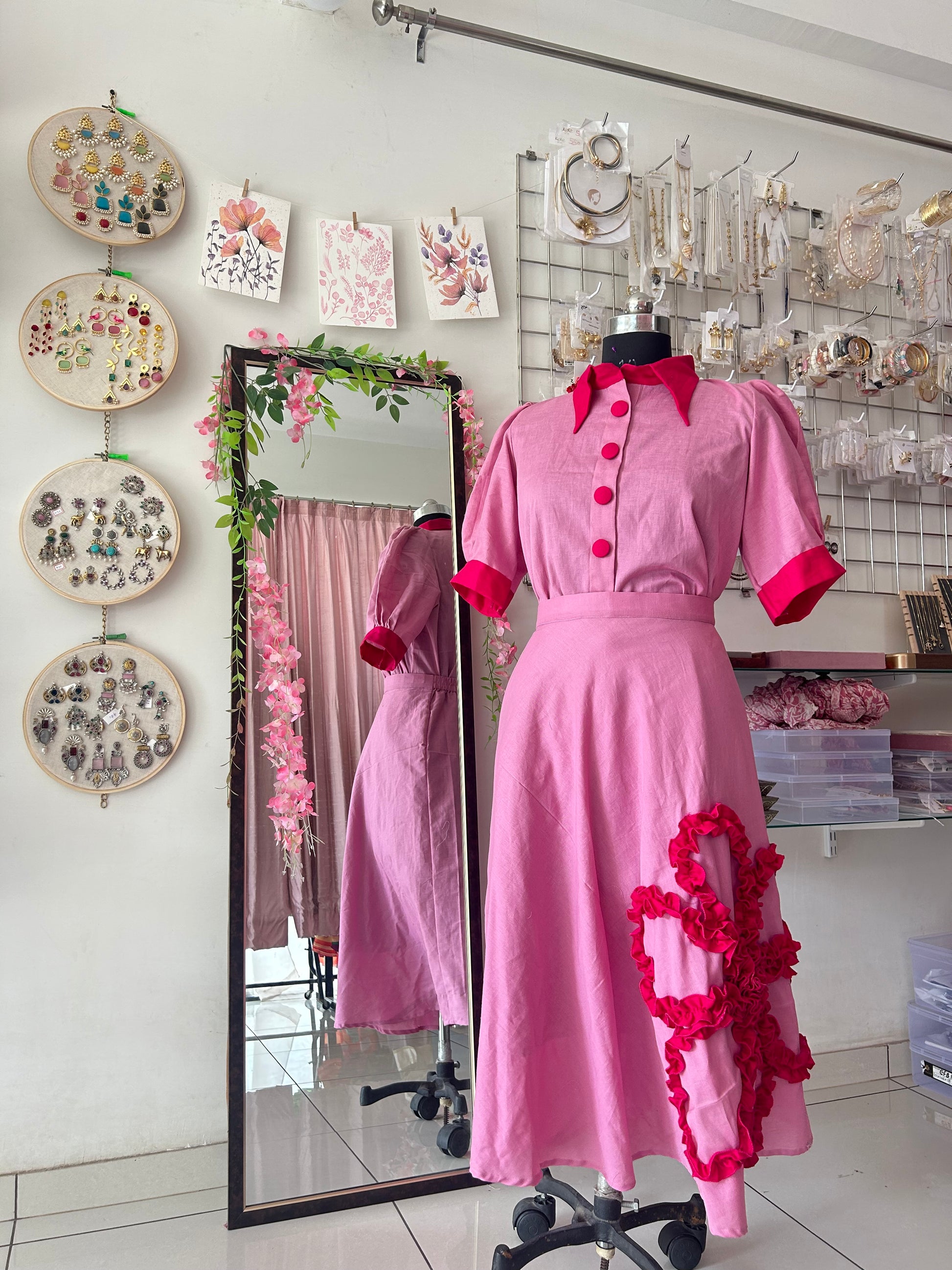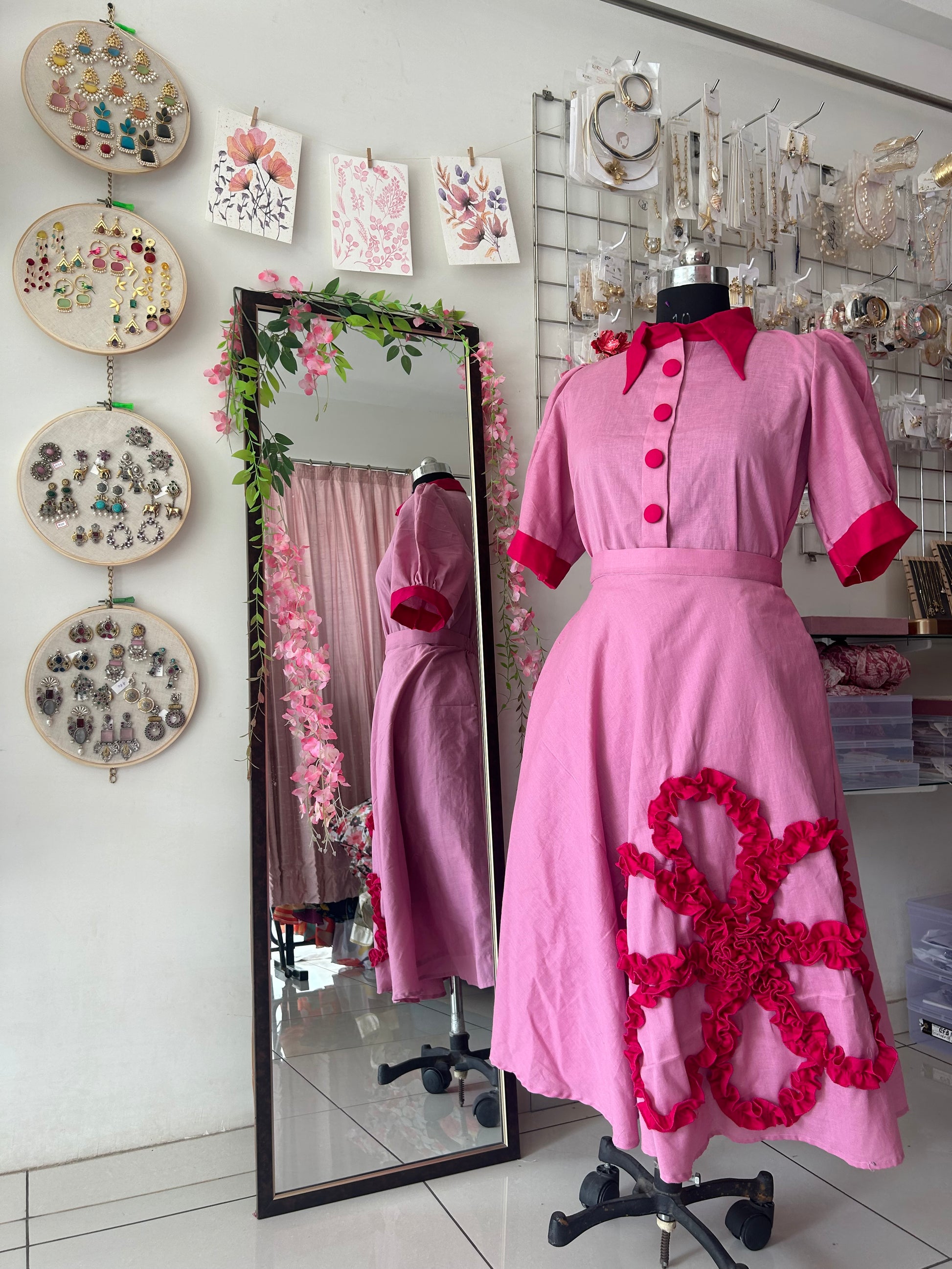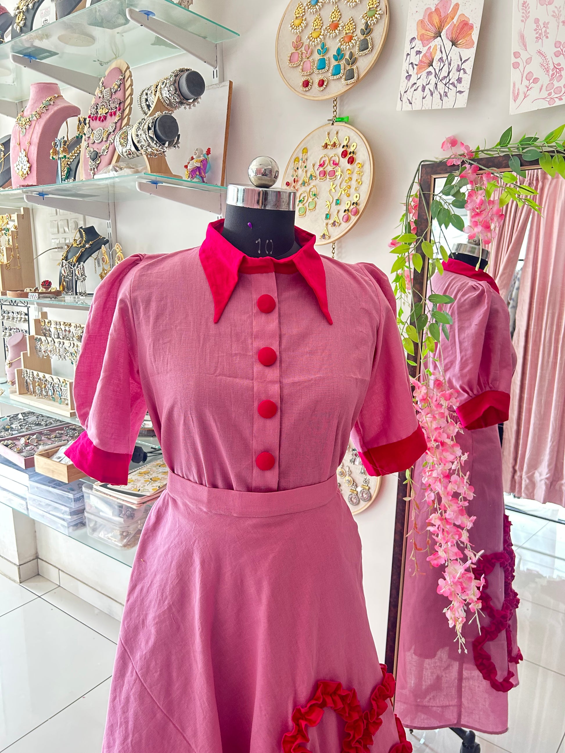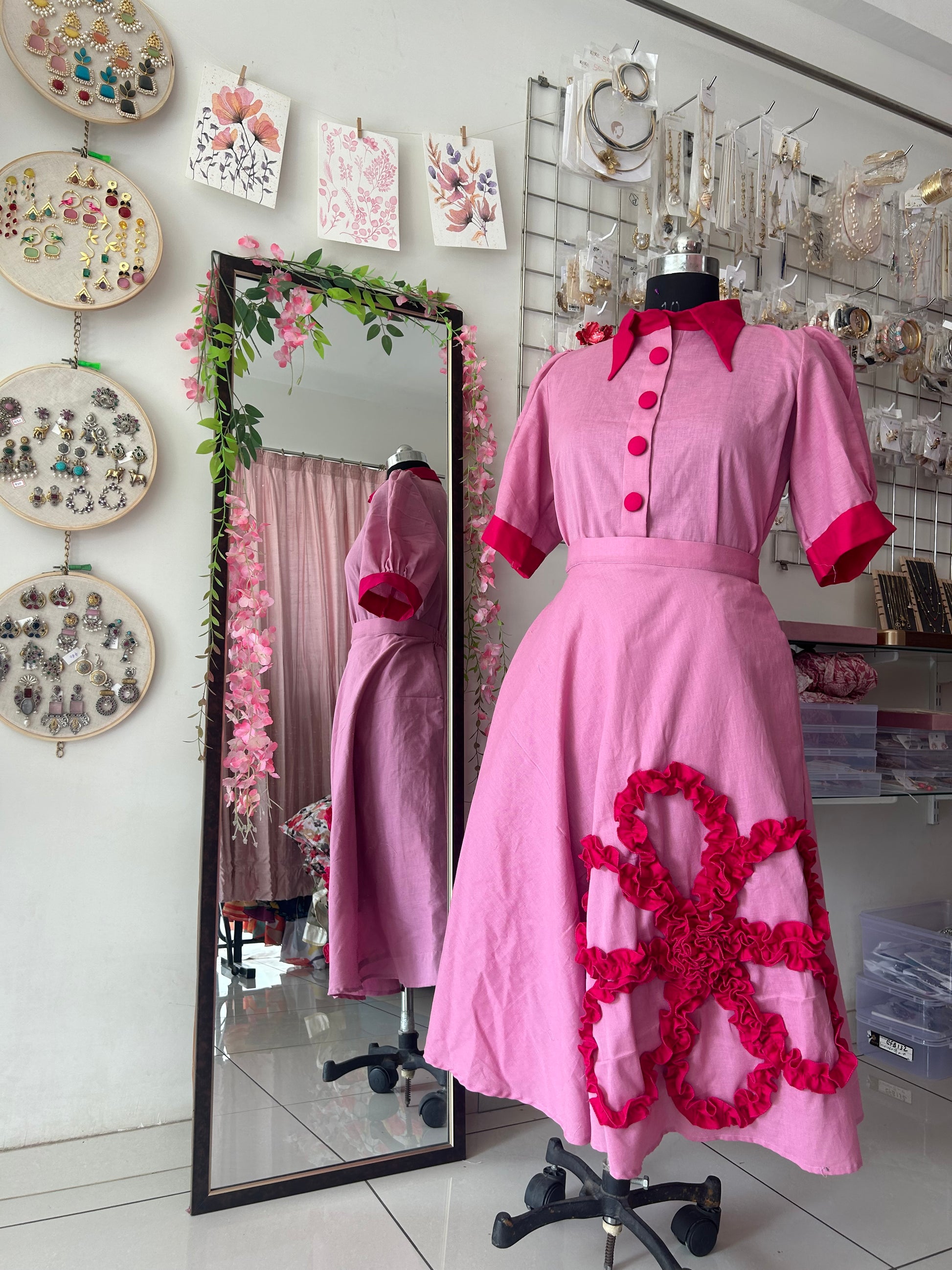 It can be worn with our light pink shirt with dark pink details , and it features a Ruffled flower on the skirt.