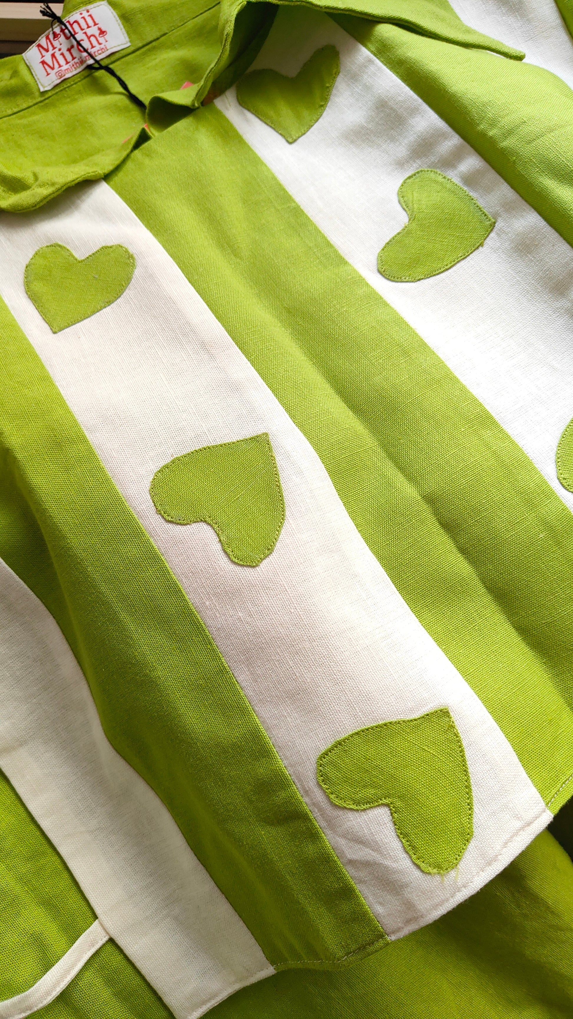 This Bright Green Shirt comes with the panelled and Appliqued Heart Vest, perfect for people who love trendy silhouettes, We made the Silhouette trendy but design will be evergreen.