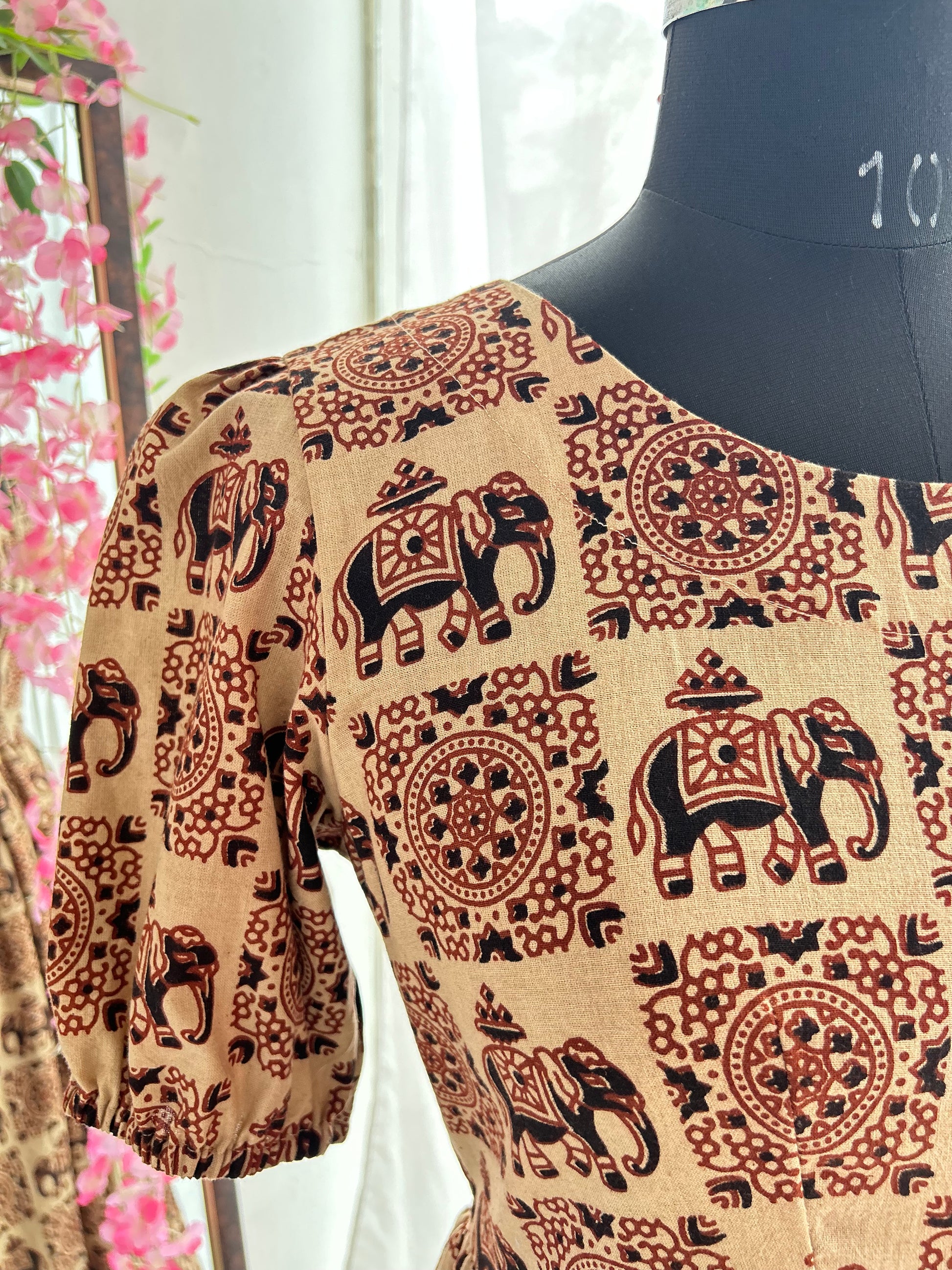 It features a Hand block Printed Hathi/ Elephant Motifs on high quality Cotton fabric in a modern Straight silhouette .