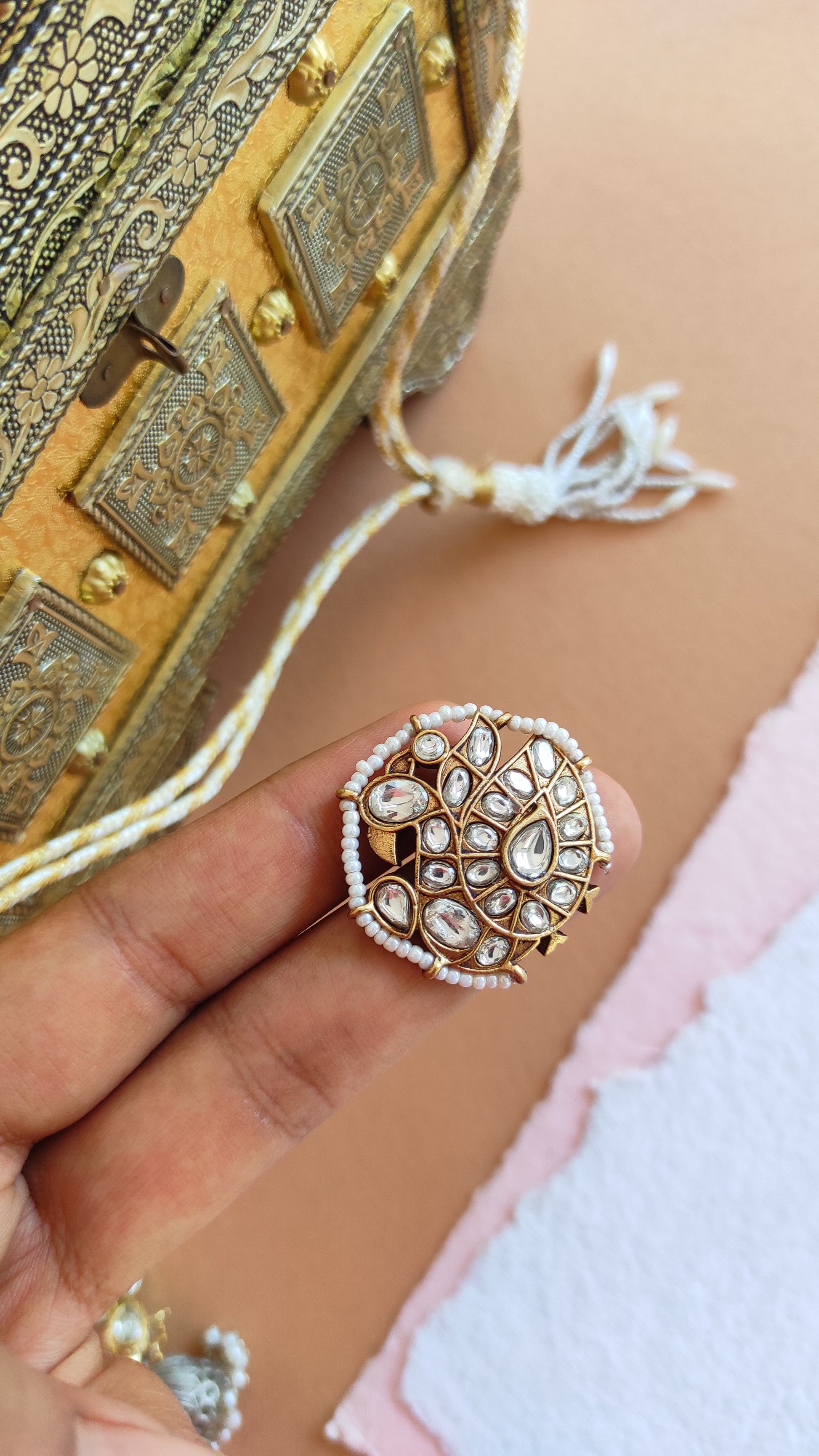 This exquisite choker set features a shimmering kundan brooch and matching peacock motif earrings, perfect for adding a touch of timeless elegance to your look.
