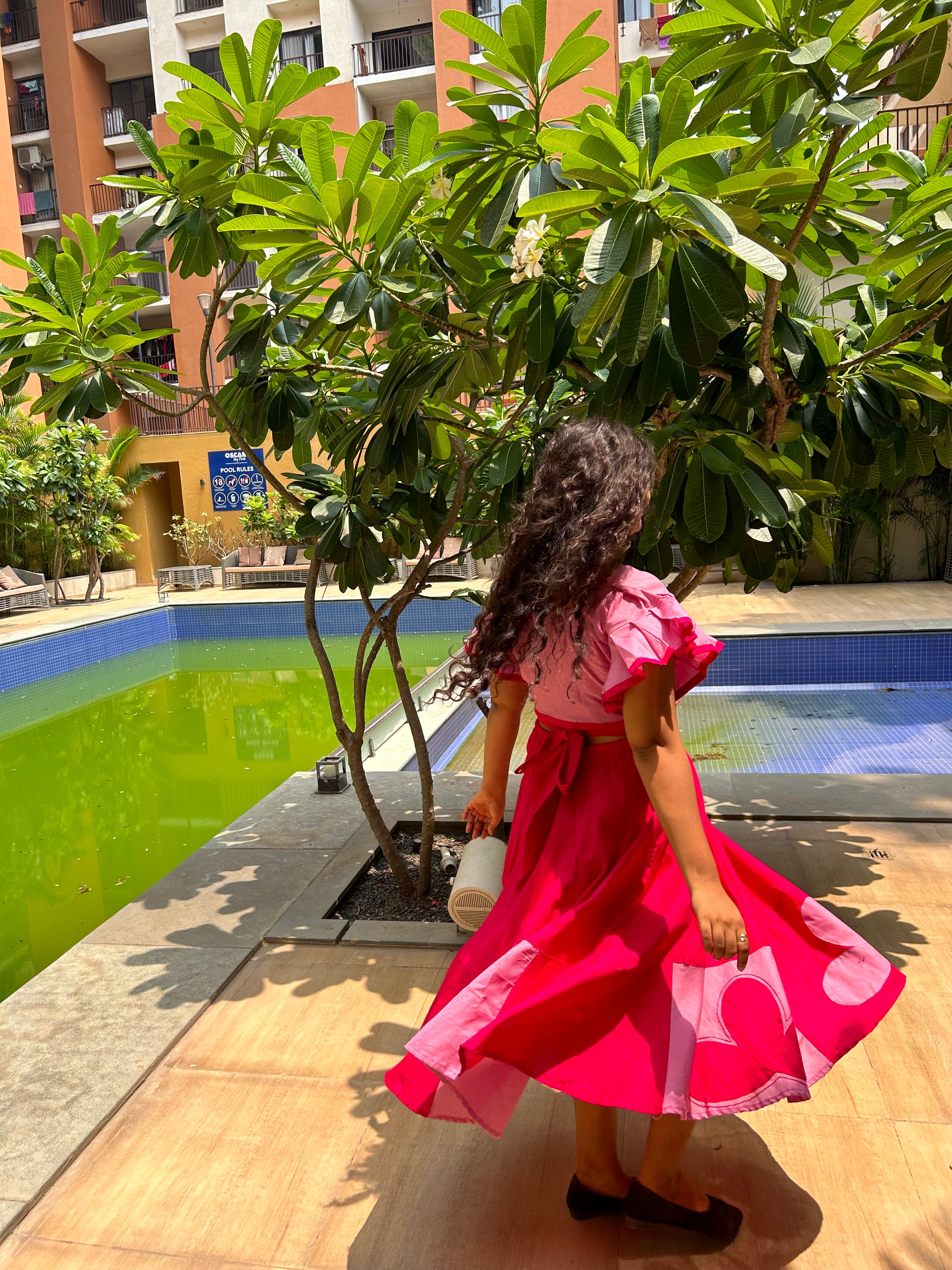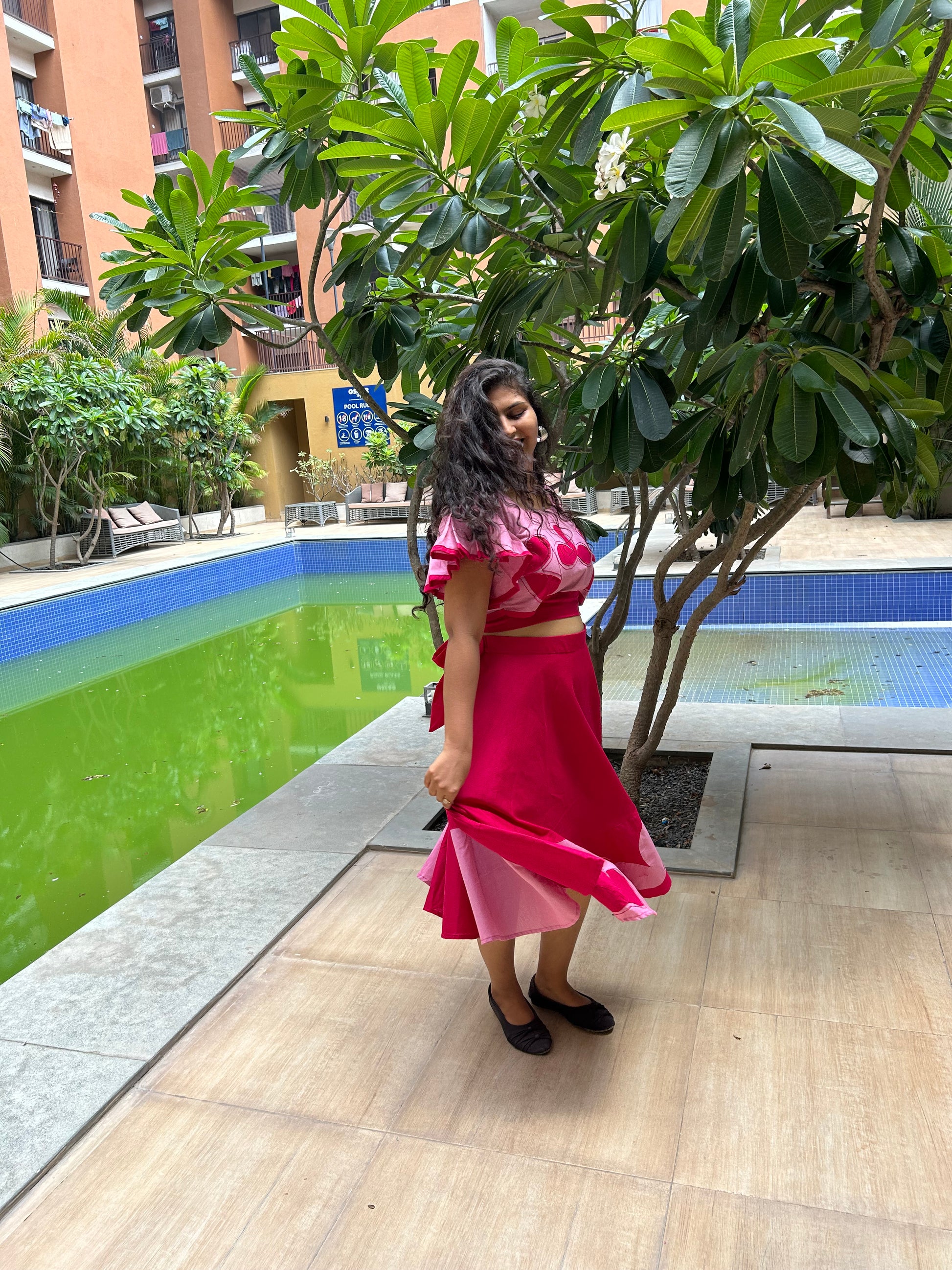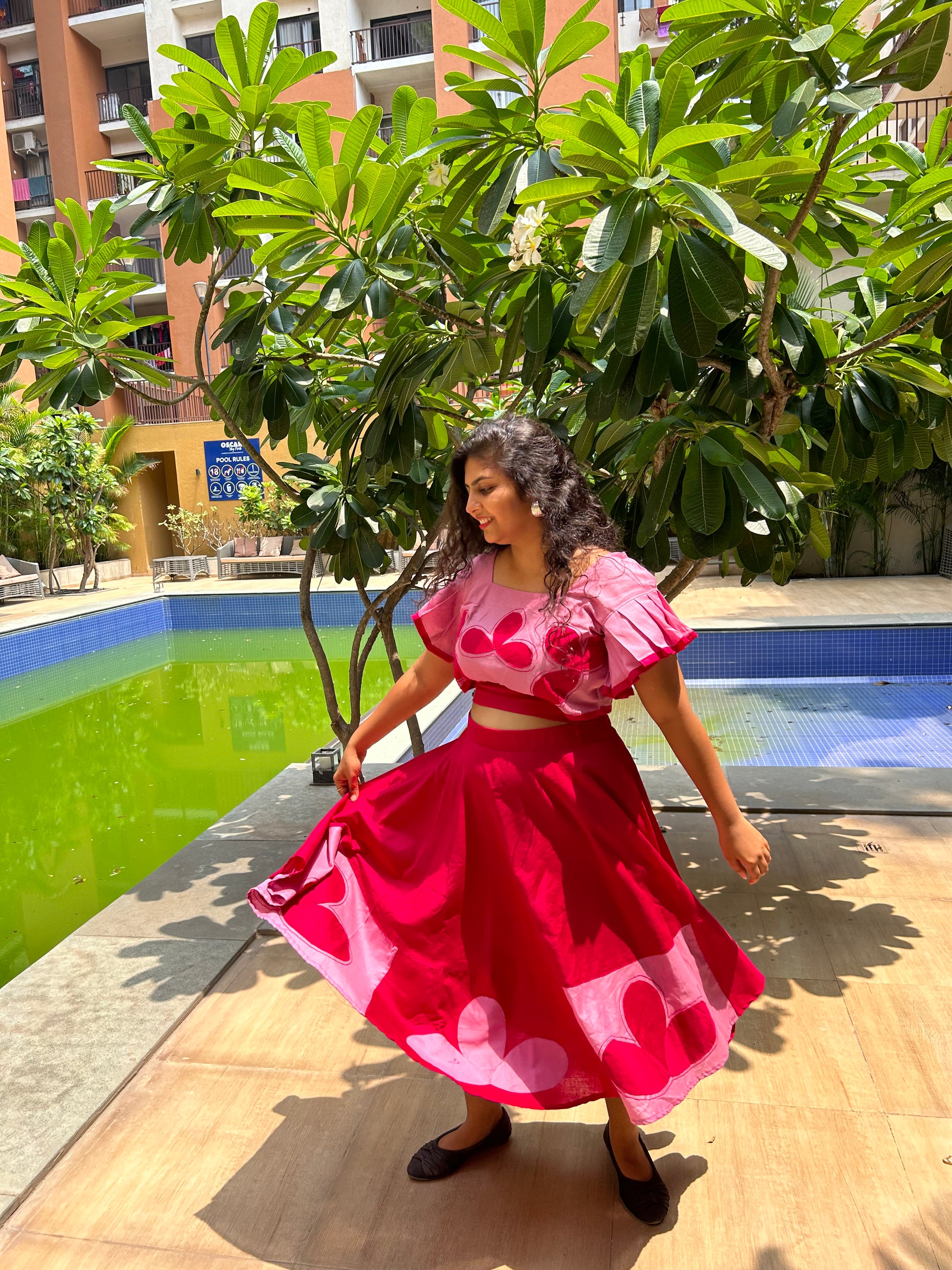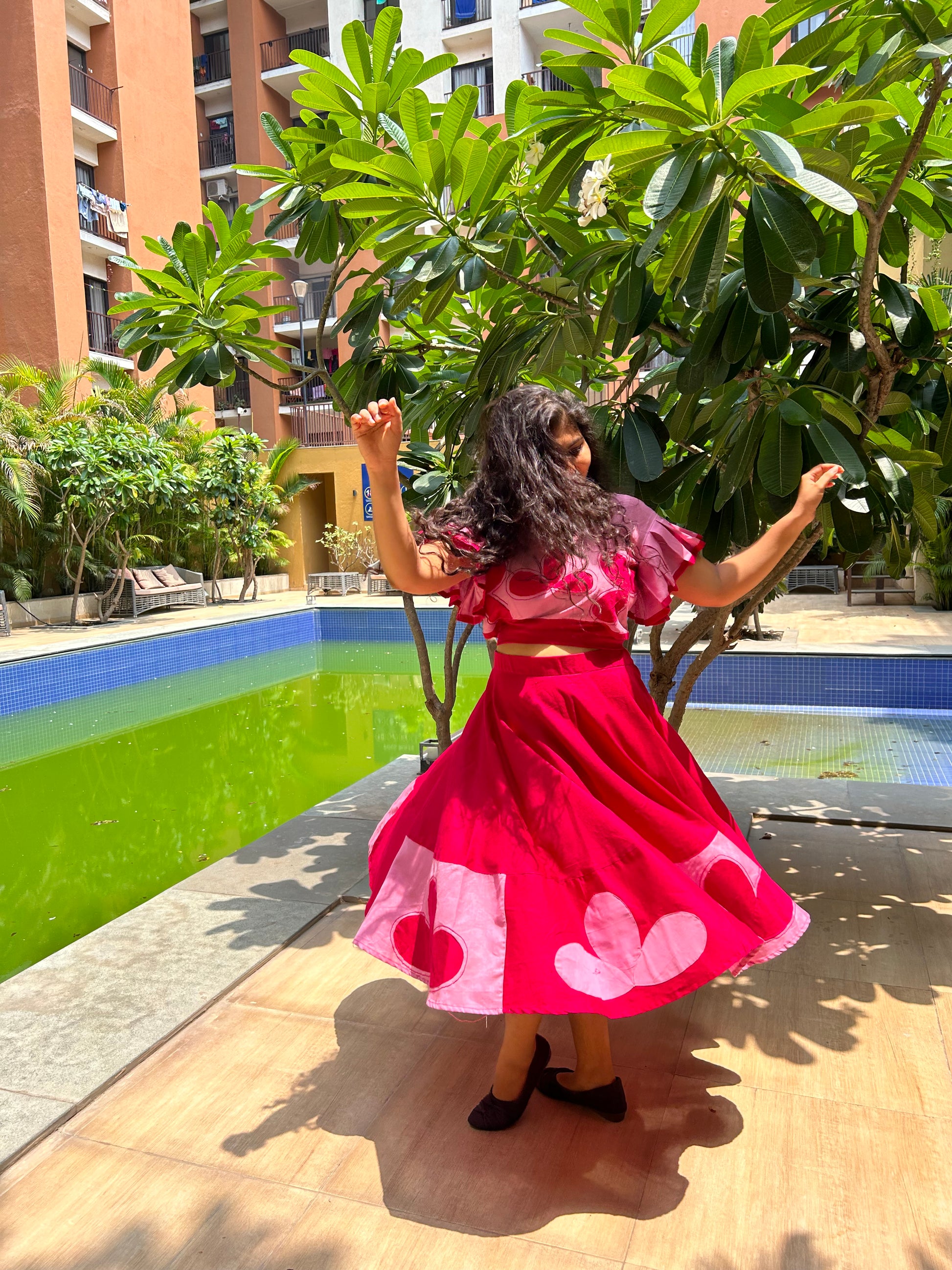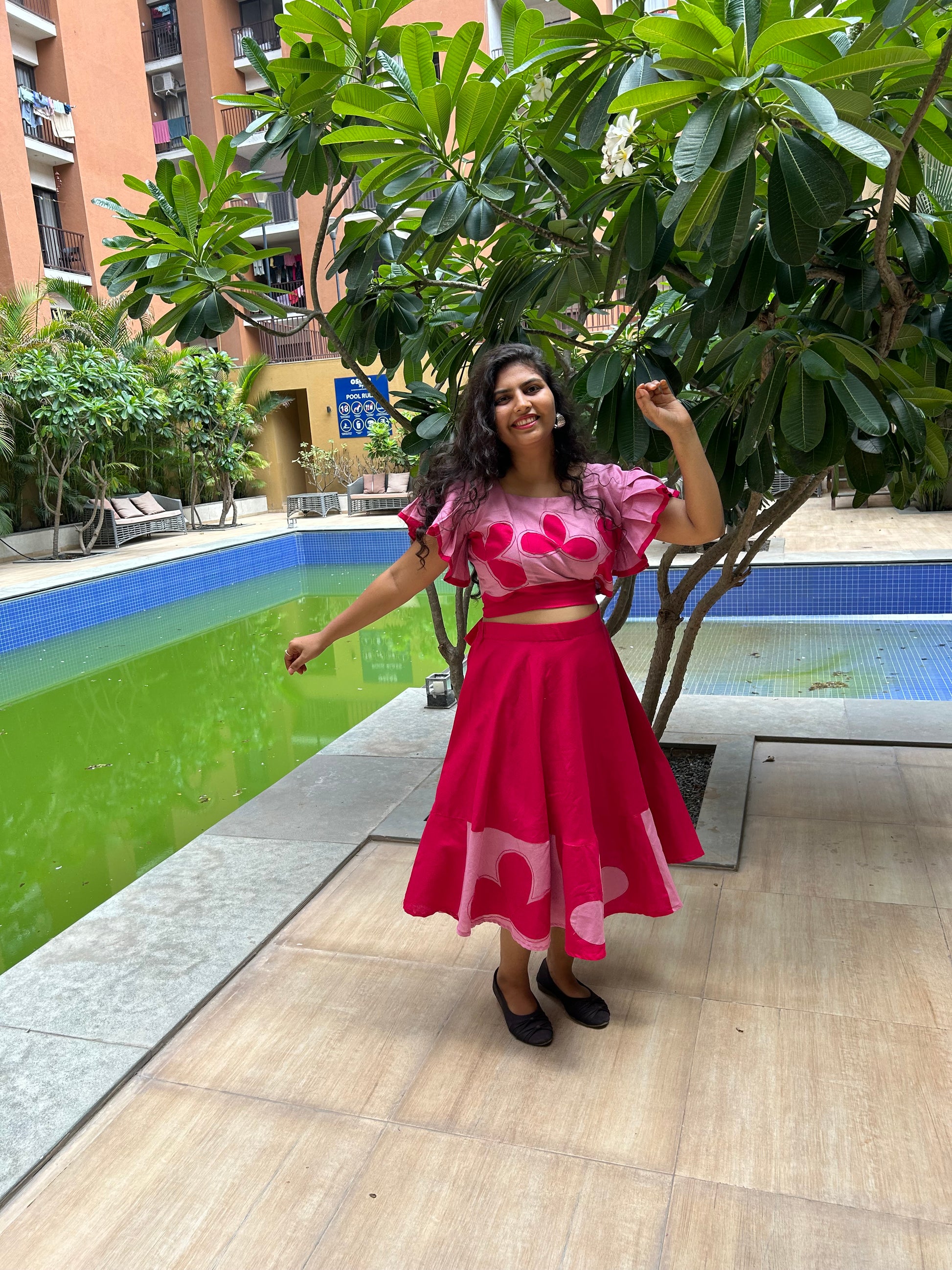 It features a light pink crop top, with pink applique work and a beautiful bow tie on the back . And a Pink Skirt with panelled Tier with Appliqué and thread embroidery, which complements the Crop Top.