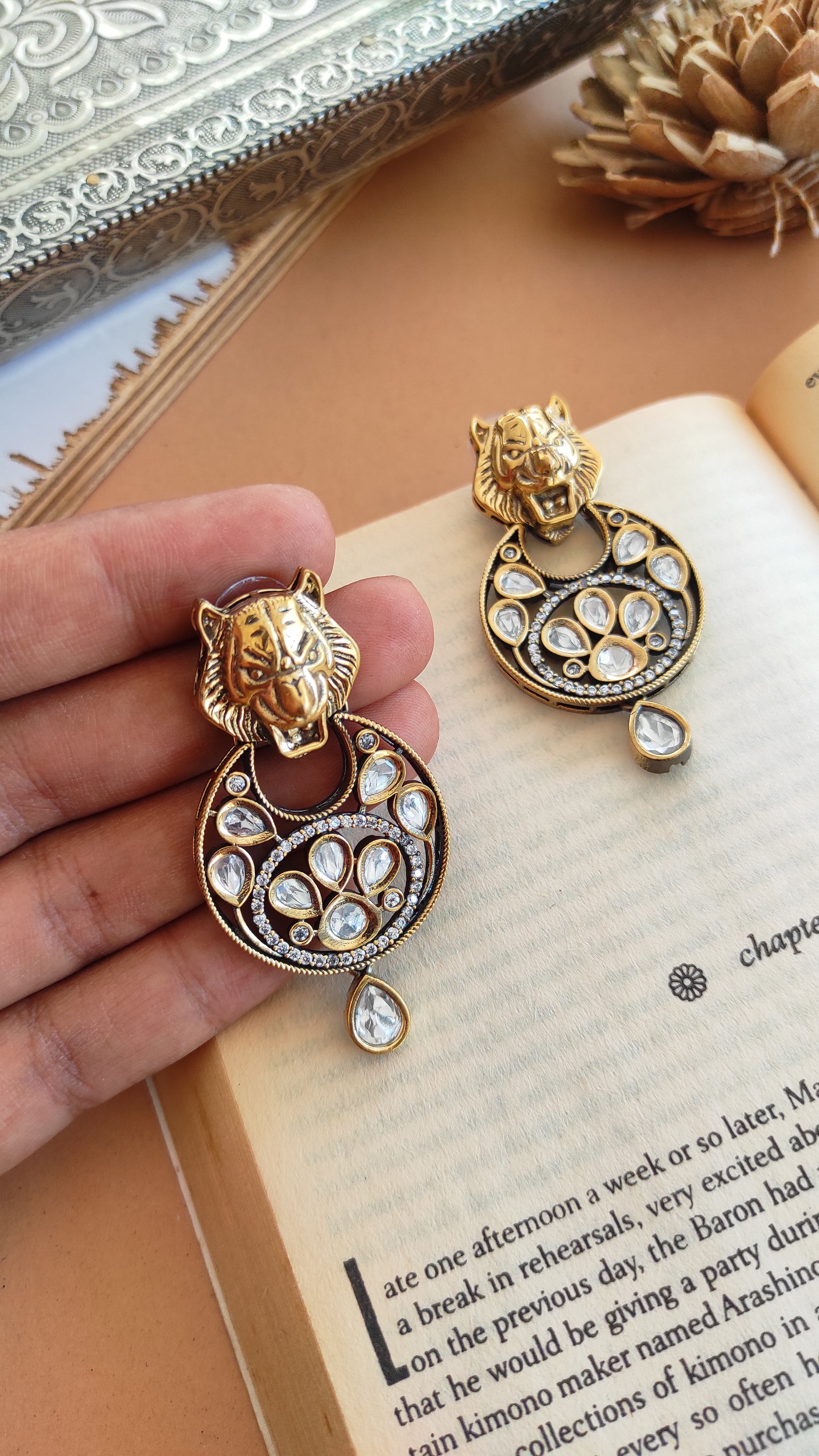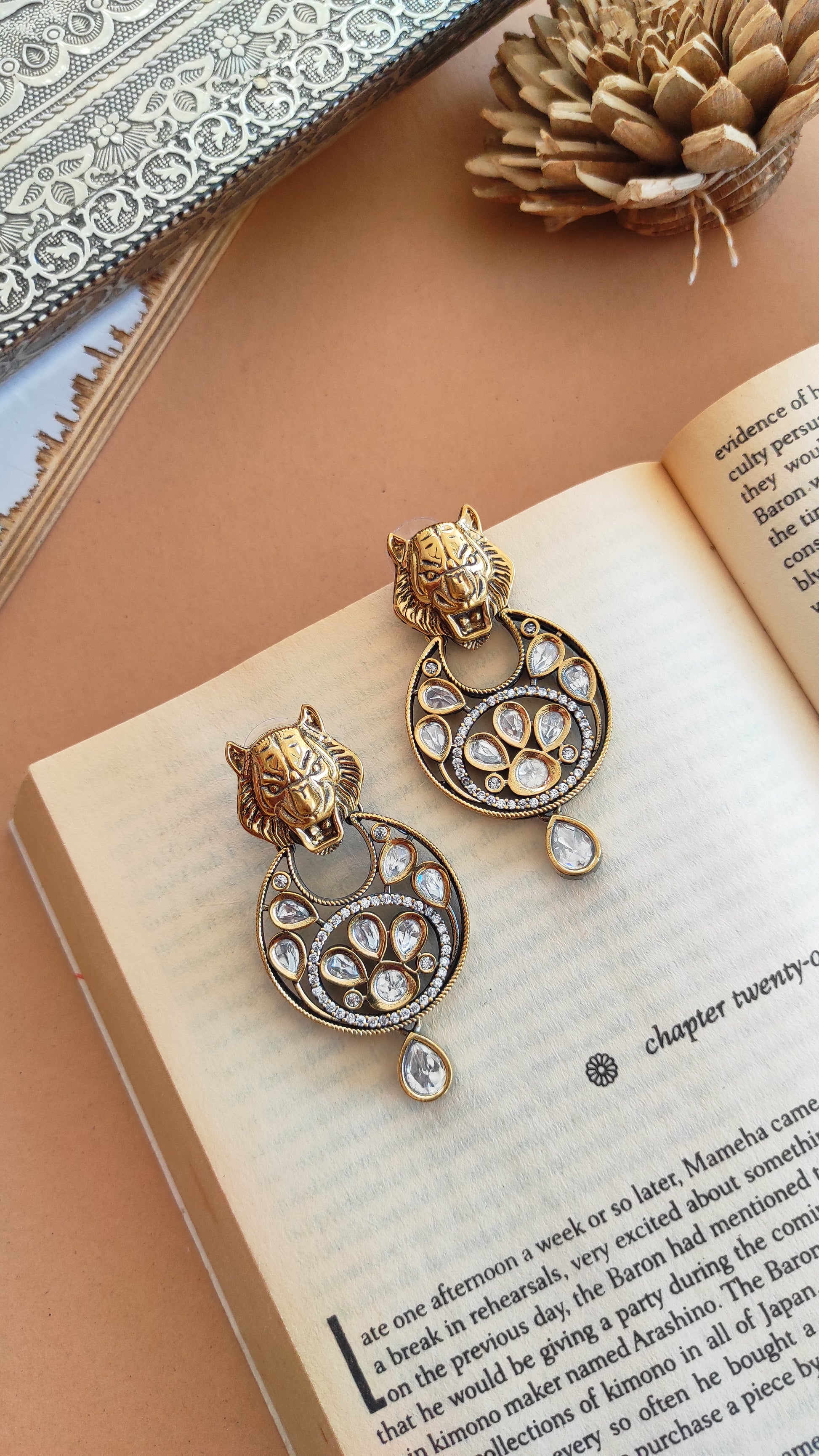 Unique panther chandbali in Moissanite stones and antique gold plating.