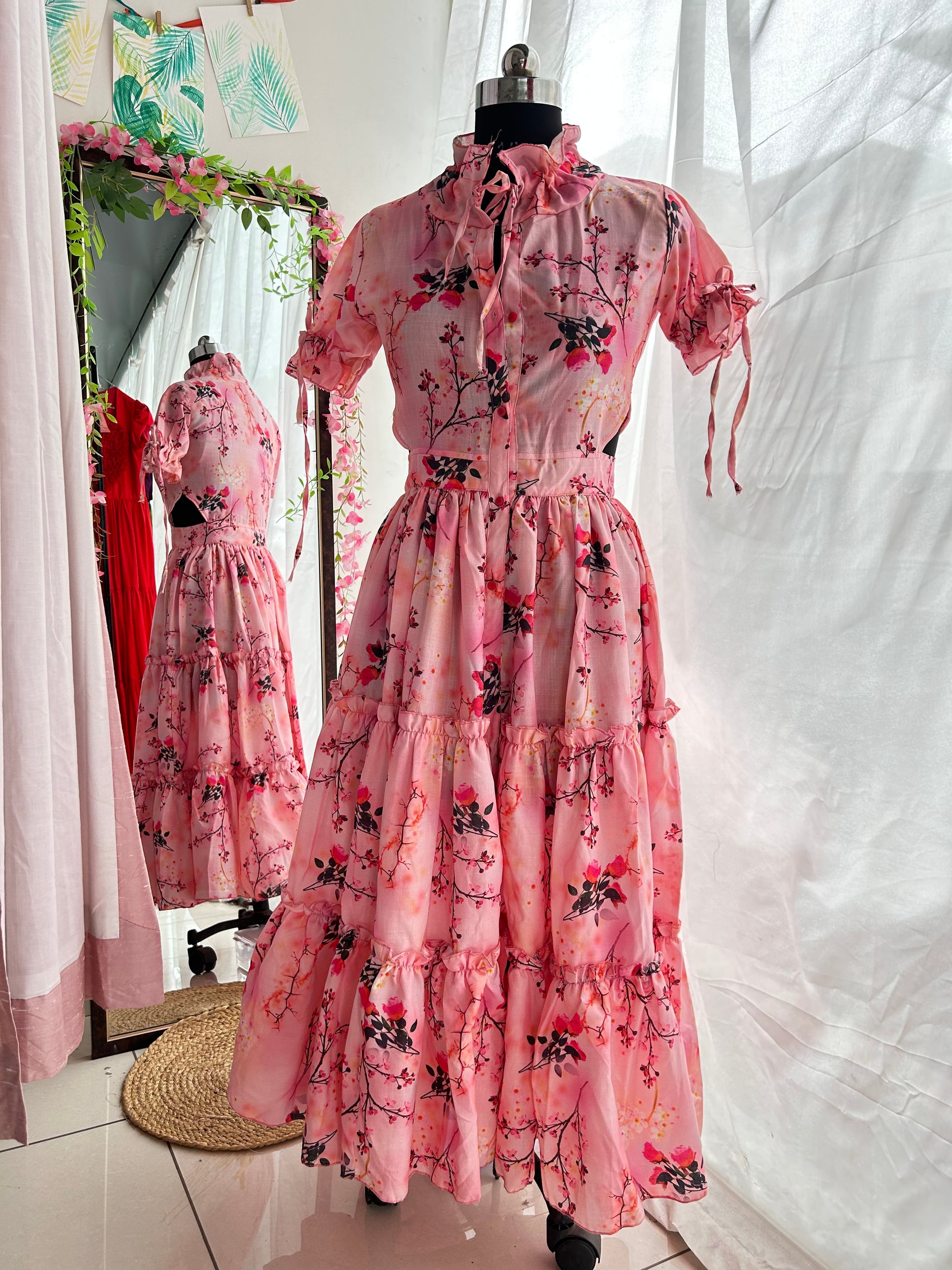 It's Comfortable and flary , multi tiered cotton Blend fabric, with waist cutout. Looks beautiful as overlay.