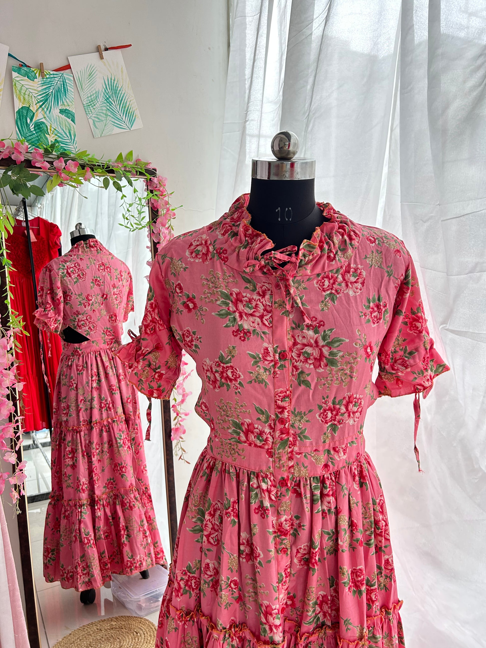 It's Comfortable and flary , multi tiered cotton Blend fabric, with waist cutout. Looks beautiful as overlay.