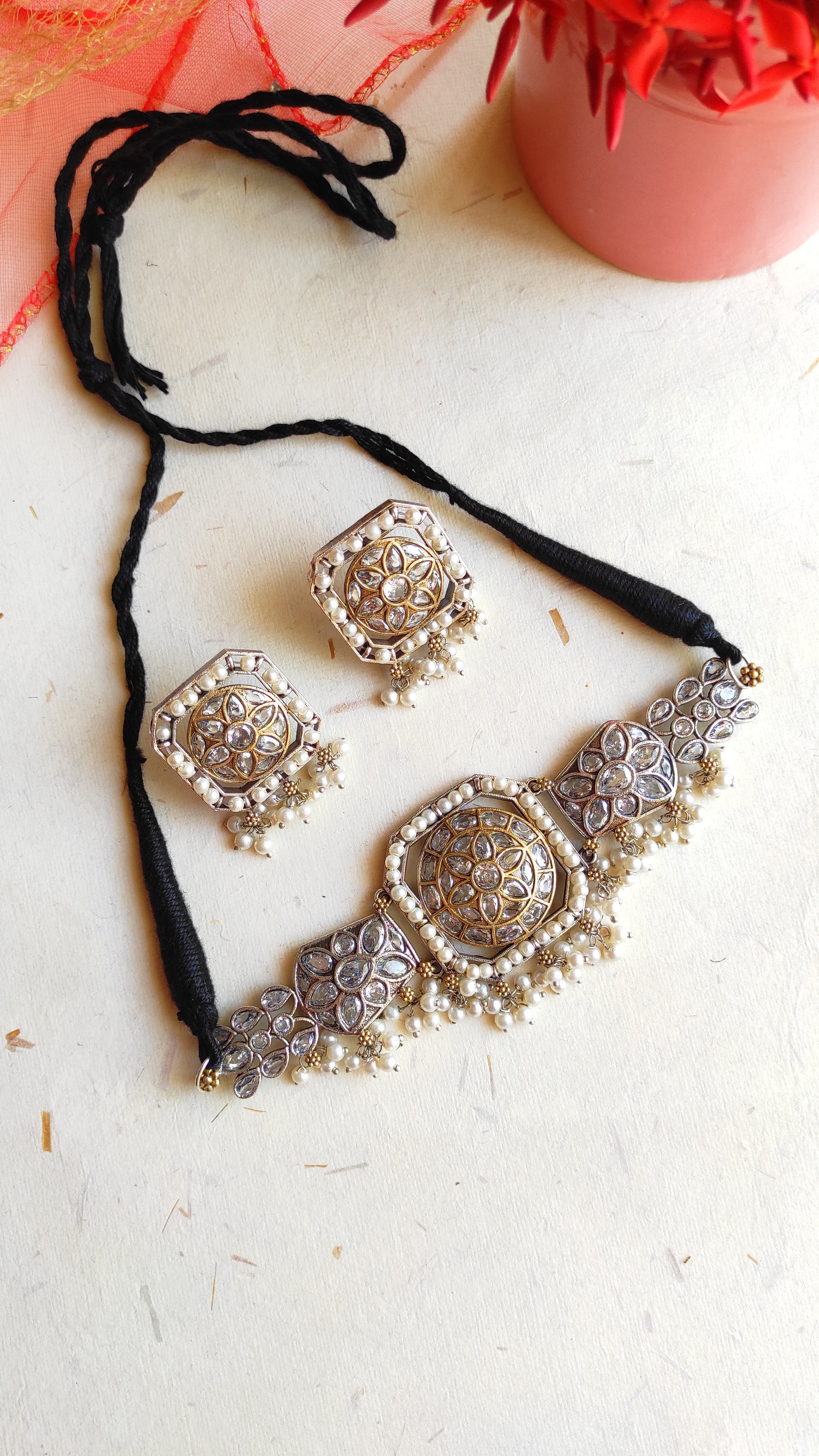 A mix of silver and gold, it's covered in sparkling white stones and includes matching earrings. Effortless elegance.