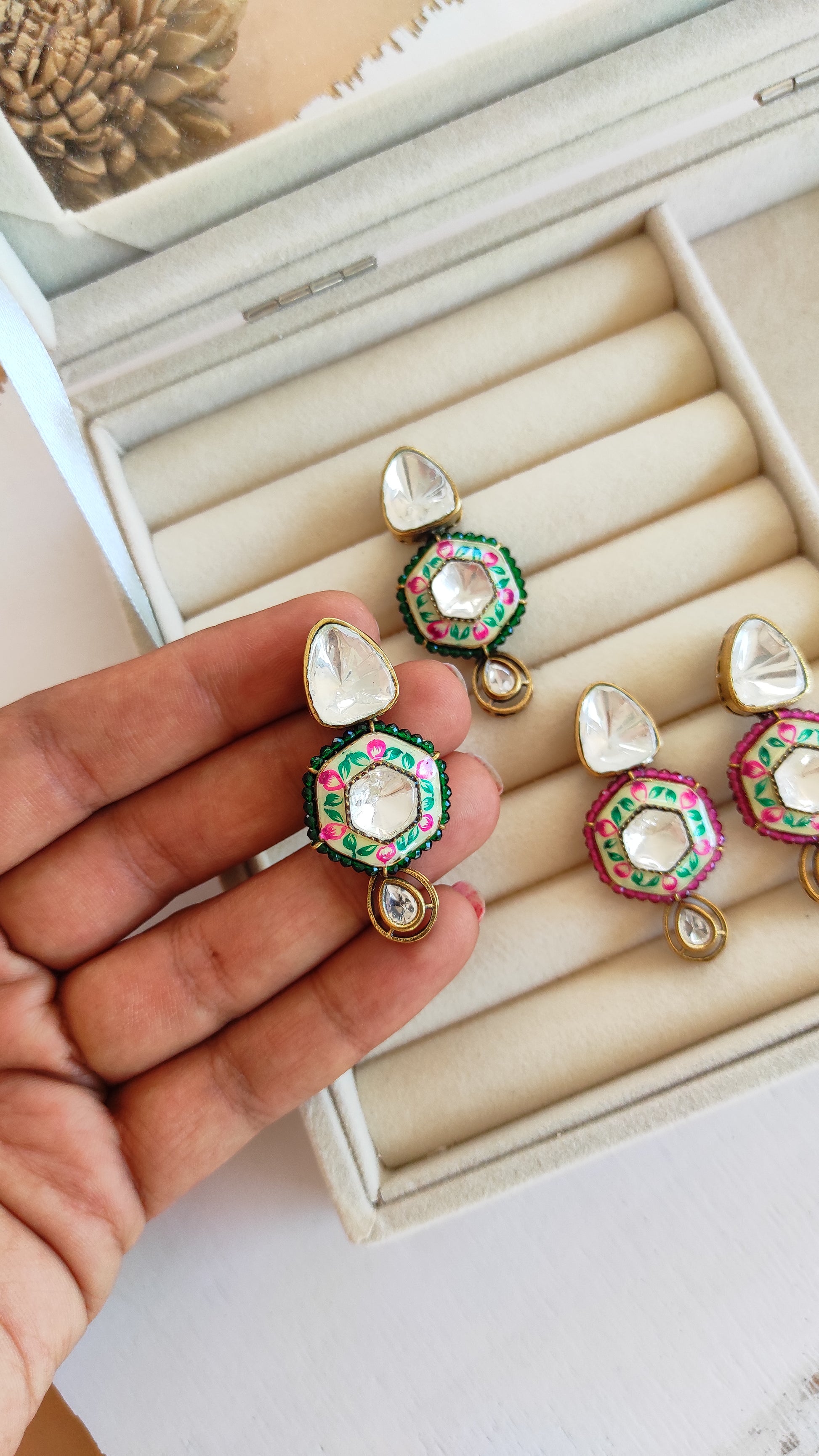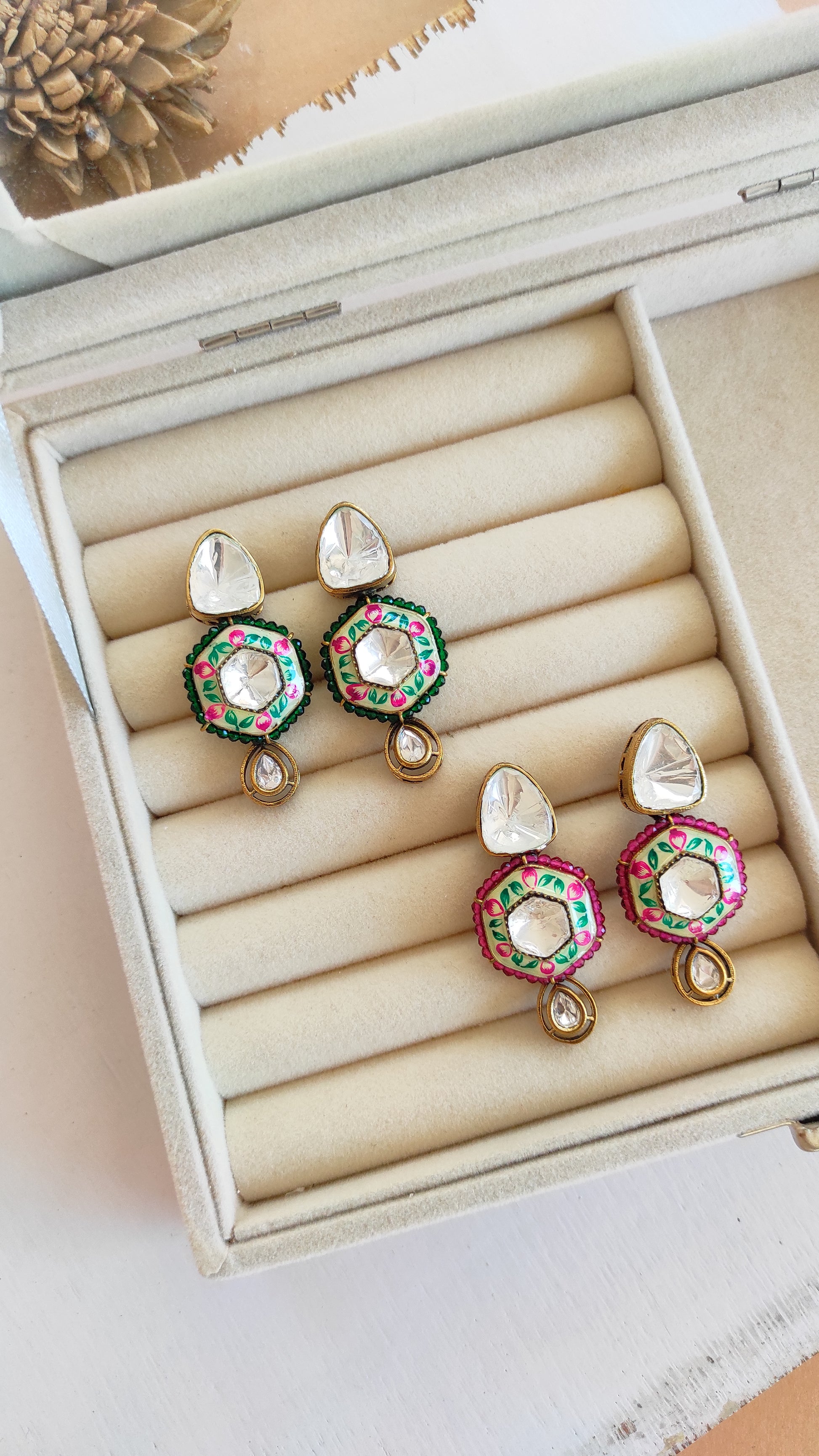 One of kind, cute and hand painted Moissanite studs in antique gold finish