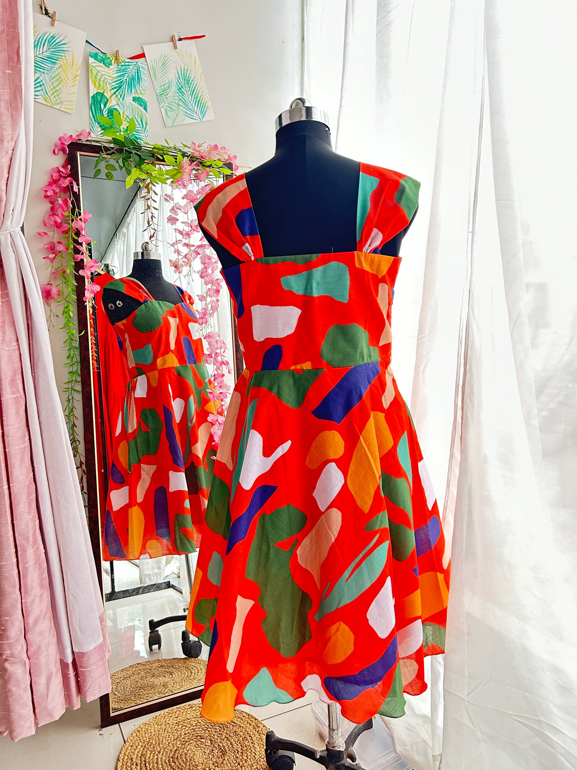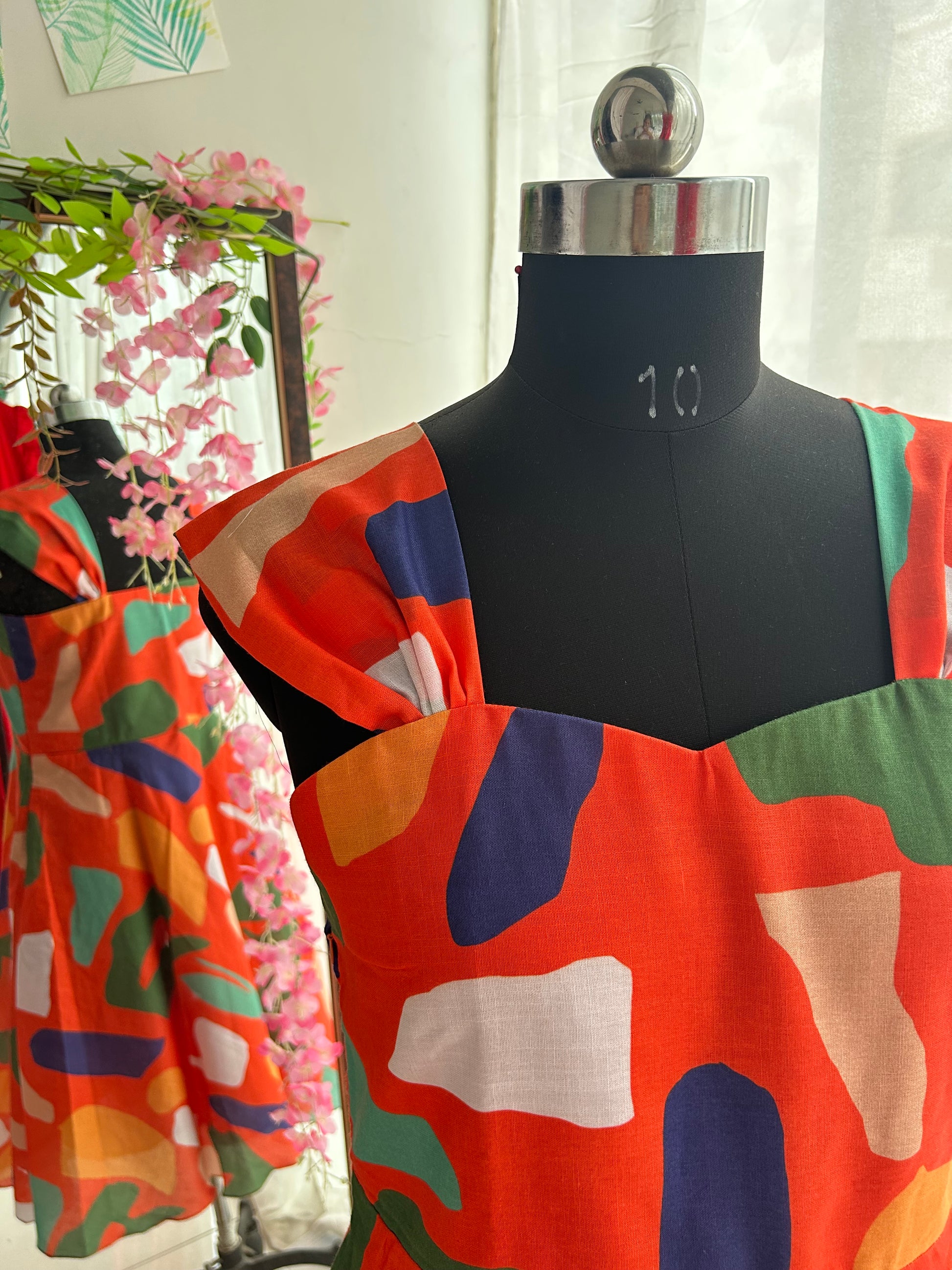 It features a bright orange print with Blobs and a fit and flared silhouette.