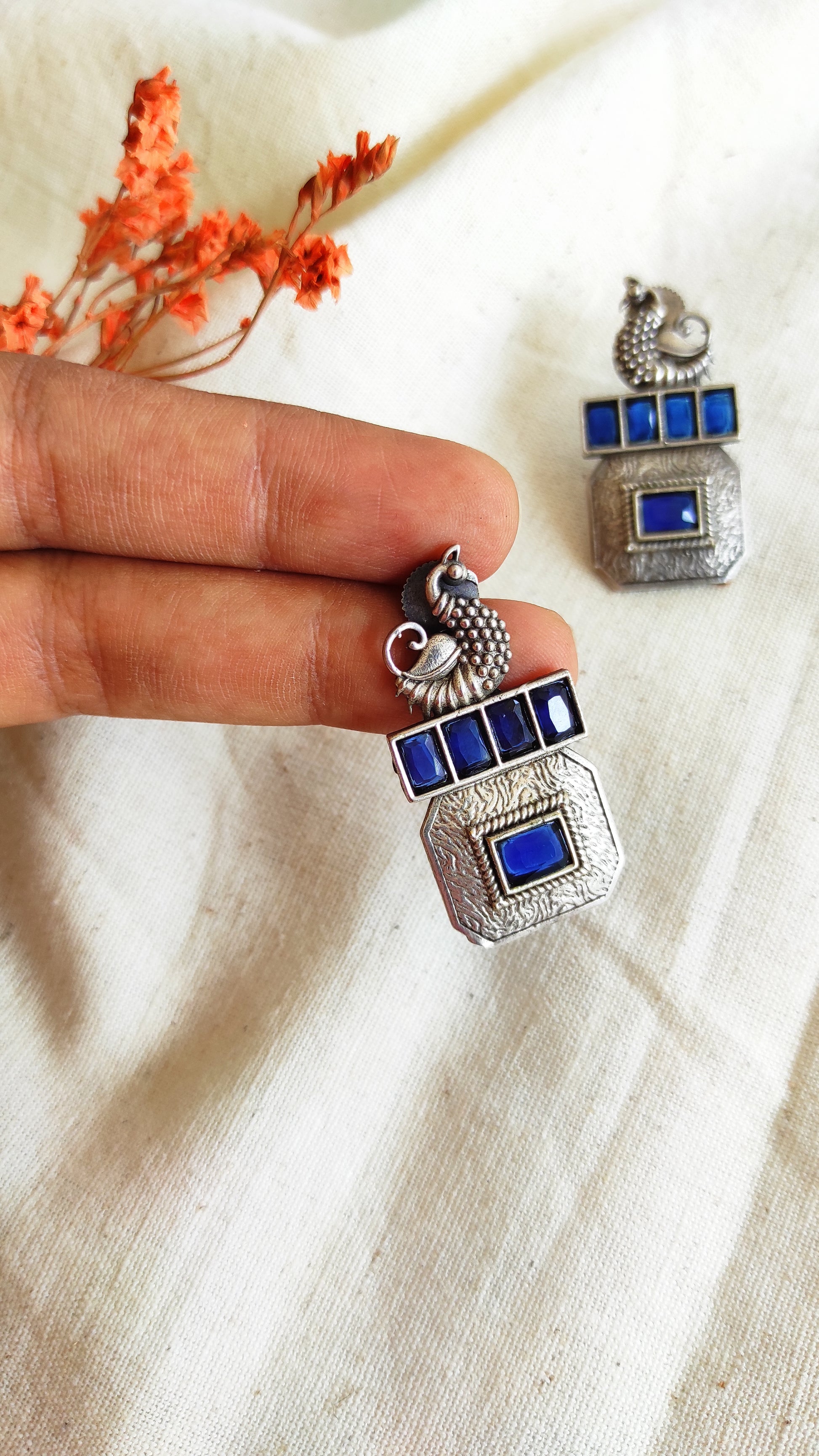 Square peacock silver lookalike studs earrings